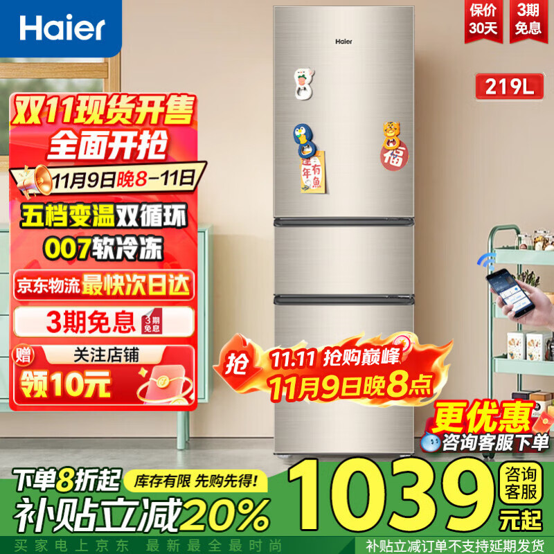 包邮 海尔冰箱219升三开门冰箱小型家用电器宿舍租房小冰箱多温区保鲜冷冻节能低噪超薄国家补贴以旧换新 219升三门直冷节能丨007软冷冻